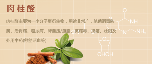 现美国,日本已研究开发将肉桂醛应用于食品添加剂中,主要是利用其杀菌,消毒,防腐的功能。肉桂醛作为食品防霉剂,对人体无毒或低毒,而对微生物的繁殖能起到较强的抑制作用。能溶于乙醇、乙醚、氯仿、油脂等。有抑菌作用,浓度为2.5×10-4时,对黄曲霉、黑曲霉、橘青霉、串珠镰刀菌、交链孢霉、白地霉、酵母,均有强烈的抑菌效果。