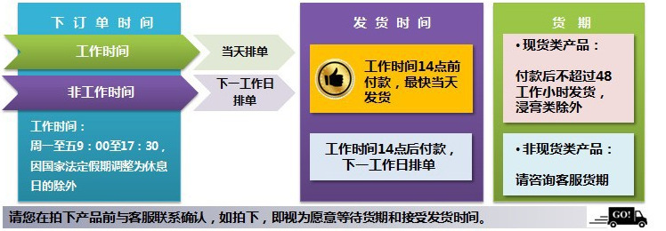 销售人员: 工作时间周一至周五,一般情况下14点前付款,可到当天发货。14点后付款次日发货(情况仅限我公司现货库存)。特殊情况下公司最后一批排单发货在4点钟,在此之前签字的单子基本上都可以发货。我公司按国家法定假期休息,周六日只接受询问和下单,不发货。